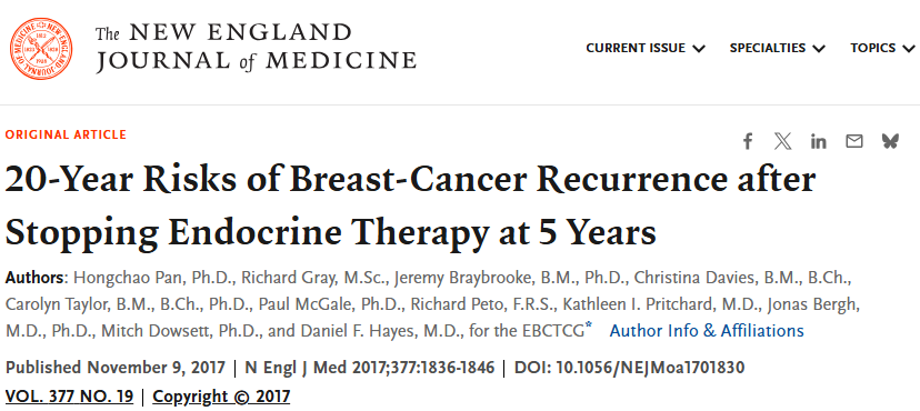 本記事のような題材(乳がん手術後ホルモン療法は何年続けるべきか?)を扱う時、必ず言及されるのがトップ画像の論文20-Year Risks of Breast-Cancer Recurrence after Stopping Endocrine Therapy at 5 Yearsです。