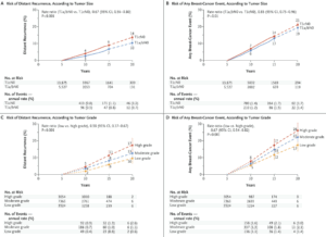 それにしても、ここで生じるのは、転移10%,再発(新規発生含む?)19%という高いリスクに対して、ホルモン療法は有効なのか?という問いです。つまり、そのフリーフォール状態(薬物療法をまったくしなかった)は、ホルモン療法で食い止められたのか?という問いです。