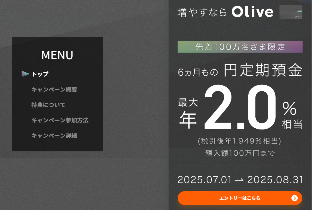 そんな中Oliveにおいて金利年相当2.0%のキャンペーンが打ち出されました(トップ画像)。