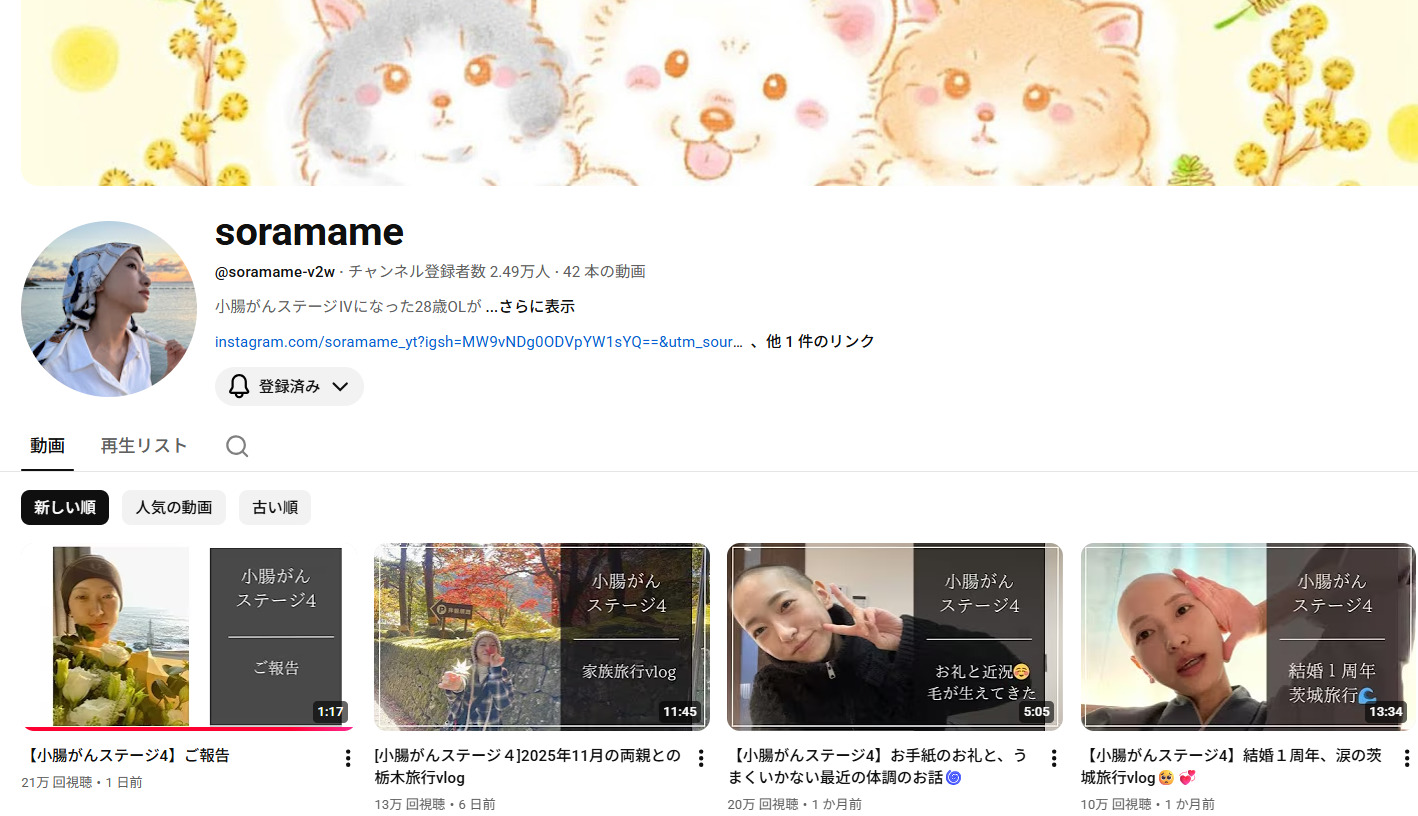 サムネイルがsoramameさんだったので、何気なく近況報告だと思って見たのですが(最近は辛いので動画がアップされているのだけ追っていました)、内容は旦那様によるものでした。